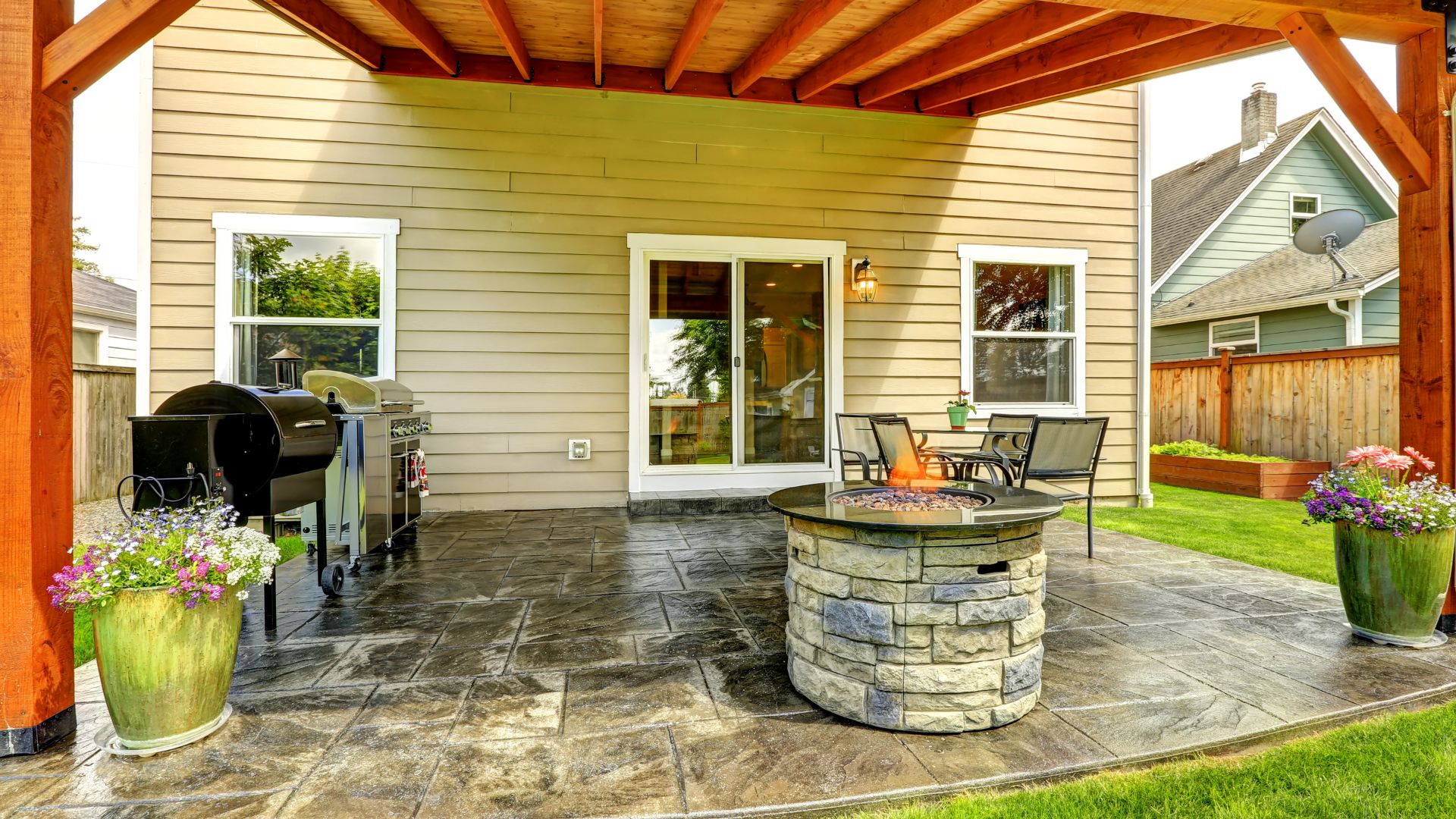 Concrete pavers and stamped concrete are popular low-maintenance choices. They’re durable, weed-resistant, and easy to clean.